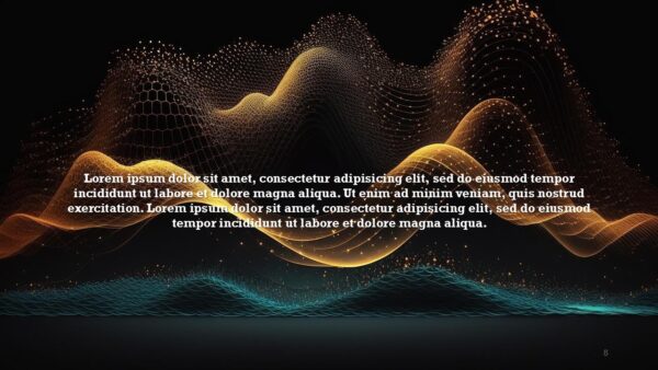 - Visually striking effects due to abstract data generation images with golden and cyan waves.
