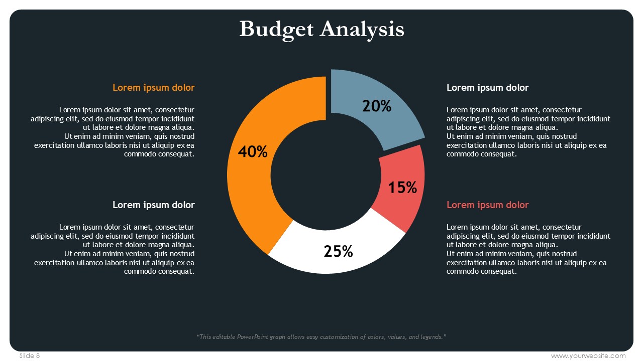 - The color scheme embodies elegance with a Dark Blue-Grey Background along with Red and Orange Accents energizing the theme.
