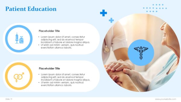 - Geometric shapes, infographics, and medical icons for a structured, clean presentation.