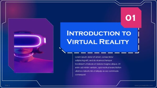 VR-Focused Design:- Tailored for presentations on applications, technologies, and trends in virtual reality.
