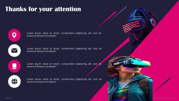 VR-Focused Design:- Tailored for presentations on applications, technologies, and trends in virtual reality.