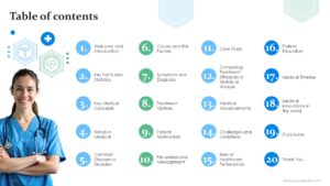 The doctors, healthcare professionals, and medical researchers who demand elegant and contemporary presentations will find this Free Woman Doctor PowerPoint Template striking. This Free Woman Doctor Powerpoint Template is best suitable for shredded practitioners, medical trainers, and scholars who require a sleek, up-to-date presentation. This template layout is concentrated on the medical topics like female doctors, health care, and patient education. This template features a modern geometric design with an accent of blue and green which conveys trust, innovation, and professionalism. The layout focuses on Female doctors and other relevant topics like Patient Education and is specialized in medical topics. With this 16:9 widescreen template, you won’t miss any display whether on PowerPoint, Google Slides, or Keynote as it is compatible with all three devices.